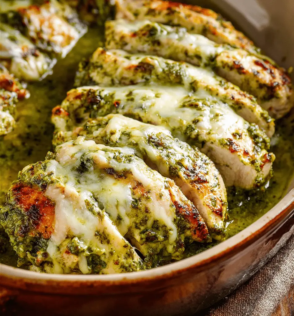 If you’re hosting friends or family and want to serve something that feels a bit elevated without spending hours in the kitchen, this dish is the answer. The presentation—juicy chicken breasts layered with vivid green pesto and golden, bubbling cheese—is eye-catching and elegant. It plates beautifully and pairs well with wine, especially a crisp white like Sauvignon Blanc or a light Pinot Grigio.